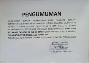 - Peserta didik kelas X dan Kelas XI melakukan aktifitas belajar di rumah masing-masing mulai tanggal 19 Maret s/d 4 April 2020 dan untuk kelas XII tetap mengikuti UNBK dan US sesuai jadwal yang telah ditentukan.