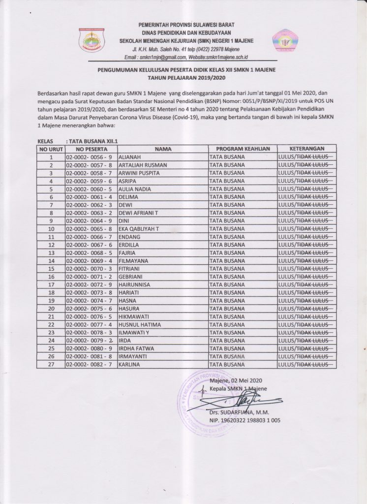 Pengumuman Kelulusan Tahun Pelajaran 2019/2020On2 Mei 2020InPengumuman Tata Busana XII.1 BUS XII.1 | BUS XII.2 | BUS XII.3 | BUS XII.4 | BOGA XII | CANTIK XII | TKJ XII | HOTEL XII Pages 1 2 3 4 5 6 7 8 Share your love Previous Pos Ujian Nasional 2020 Resmi Ditiadakan Next Pos Jadwal PPDB SMK Negeri 1 Majene Newsletter Updates Enter your email address below and subscribe to our newsletter Subscribe