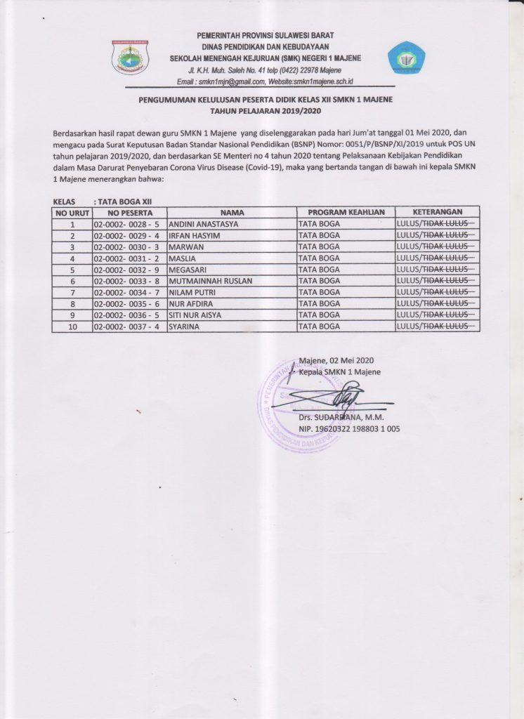 Pengumuman Kelulusan Tahun Pelajaran 2019/2020On2 Mei 2020InPengumuman Tata Boga XII BUS XII.1 | BUS XII.2 | BUS XII.3 | BUS XII.4 | BOGA XII | CANTIK XII | TKJ XII | HOTEL XII Pages 1 2 3 4 5 6 7 8 Share your love Previous Pos Ujian Nasional 2020 Resmi Ditiadakan Next Pos Jadwal PPDB SMK Negeri 1 Majene Newsletter Updates Enter your email address below and subscribe to our newsletter Subscribe