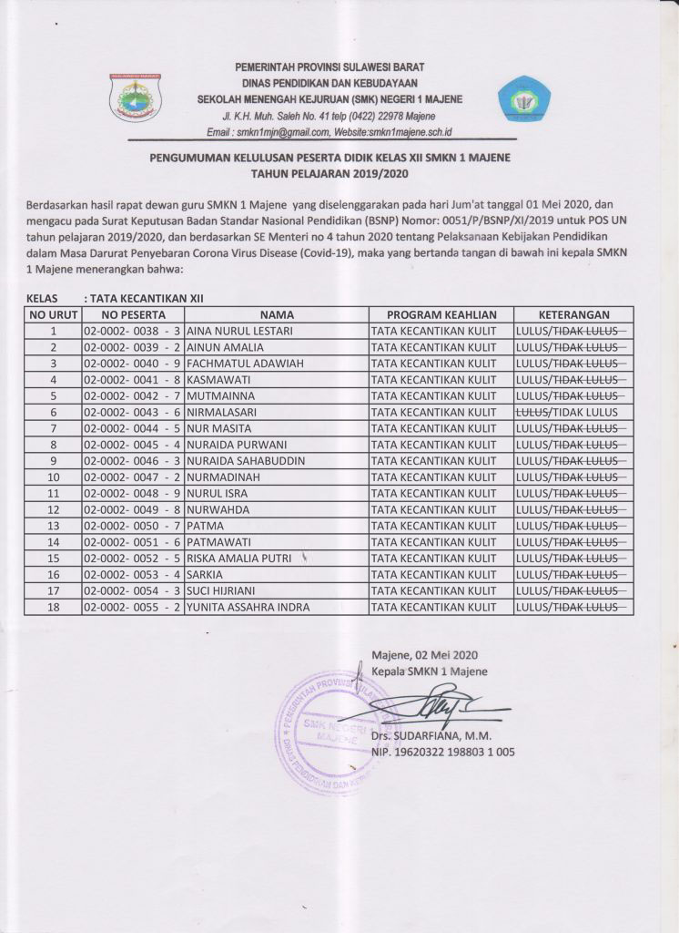 Pengumuman Kelulusan Tahun Pelajaran 2019/2020On2 Mei 2020InPengumuman Tata Kecantikan XII BUS XII.1 | BUS XII.2 | BUS XII.3 | BUS XII.4 | BOGA XII | CANTIK XII | TKJ XII | HOTEL XII Pages 1 2 3 4 5 6 7 8 Share your love Previous Pos Ujian Nasional 2020 Resmi Ditiadakan Next Pos Jadwal PPDB SMK Negeri 1 Majene Newsletter Updates Enter your email address below and subscribe to our newsletter Subscribe