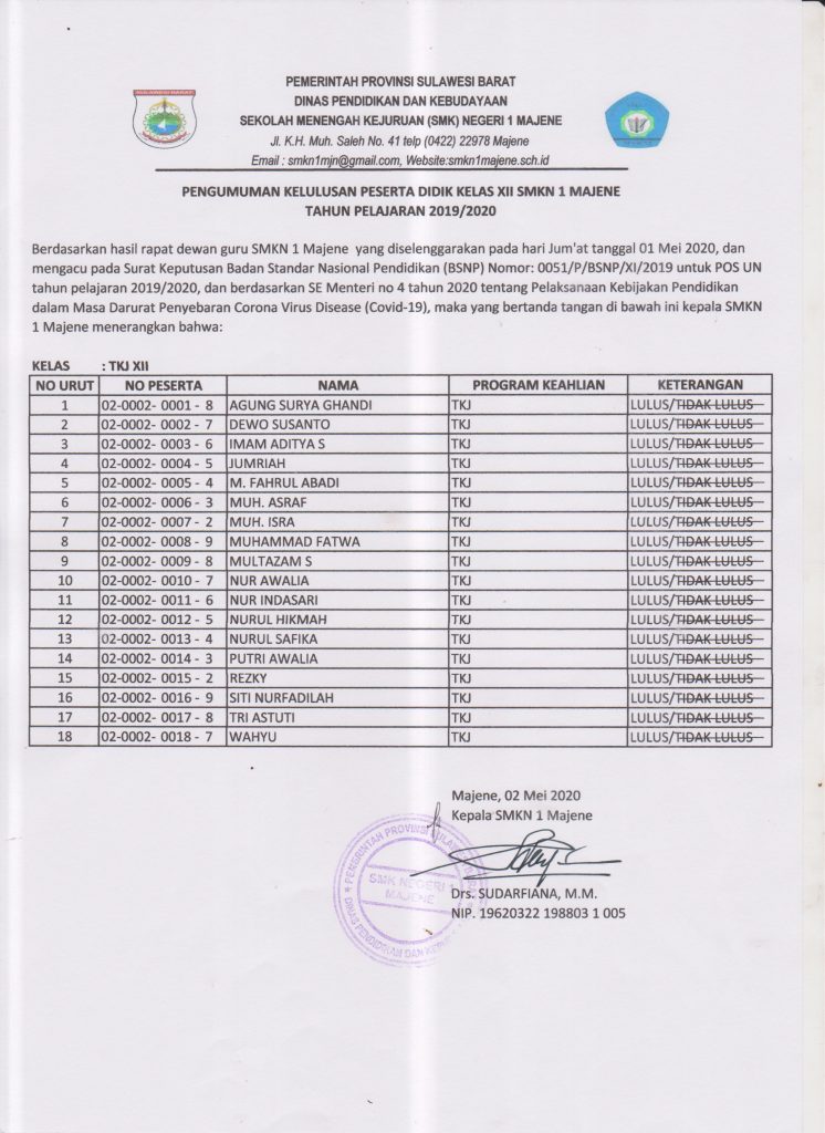 Pengumuman Kelulusan Tahun Pelajaran 2019/2020On2 Mei 2020InPengumuman TKJ XII BUS XII.1 | BUS XII.2 | BUS XII.3 | BUS XII.4 | BOGA XII | CANTIK XII | TKJ XII | HOTEL XII Pages 1 2 3 4 5 6 7 8 Share your love Previous Pos Ujian Nasional 2020 Resmi Ditiadakan Next Pos Jadwal PPDB SMK Negeri 1 Majene Newsletter Updates Enter your email address below and subscribe to our newsletter Subscribe